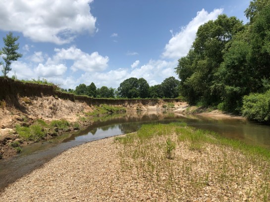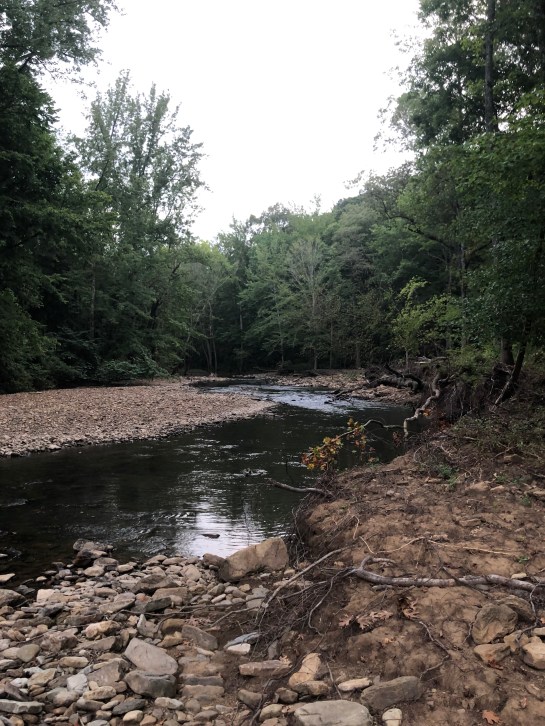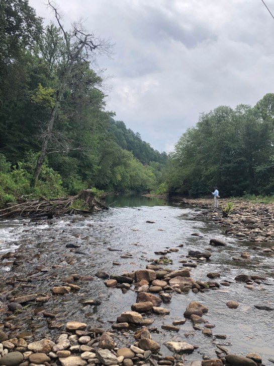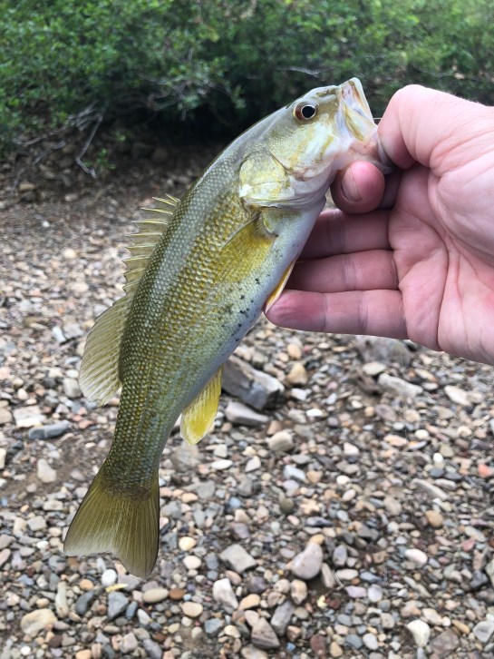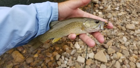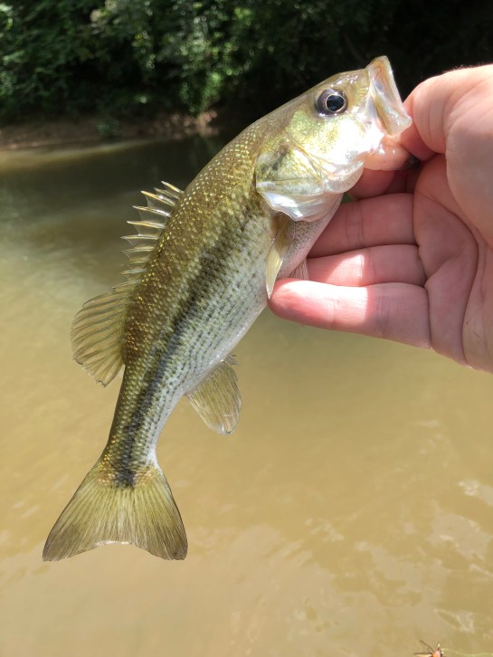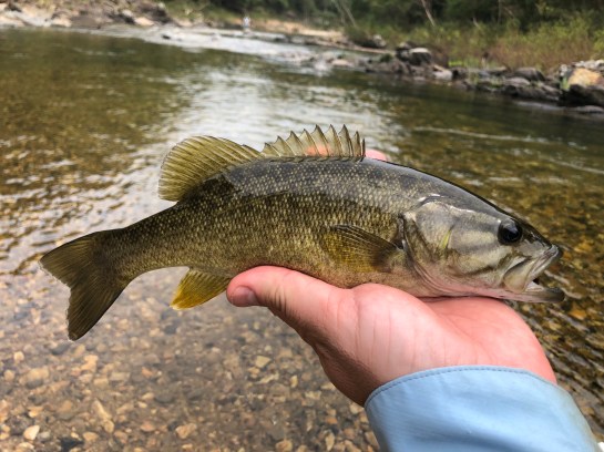 The river was beautiful. I feel like I say that about every river, but this one seemed special. It was a classic freestone river, with water as clear as any you’ll find in the South. There was a riffle at our point of access that was too appealing to pass up so that’s where we started fishing. The riffle was chock full of boulders and loads of bait darted around as we moved upstream. Upstream of the riffle was a long pool and as we continued further it was clear this was the set up – riffle, long deep pool, riffle. We caught a few sunfish (some were massive green sunfish), but it took a while before we figured out the smallmouth.