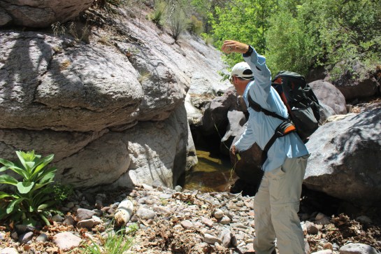 Our day was made just experiencing this canyon on our feet. Having a fly rod in hand was lagniappe. We made it to a point on the creek where small waterfalls cascaded into pools that were several feet deep; it started to look like good trout habitat. The water was crystal clear, some of the clearest water I’ve seen in a stream. Lots of small fish could be seen in each pool, not trout at first, but other smaller species, longfin dace being one of them as I’d come to later find out. It wasn’t long before the trout showed up as well.