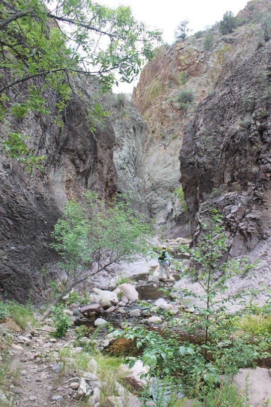 In about a quarter mile we entered into a narrow slot canyon with steep vertical walls composed of volcanic rock of many different colors, colors that I don’t typically associate with the rocks where I find trout, but not at all out of place in the desert southwest. It was an amazing landscape of sandstone and rock spires with a trickle of a creek running through it.