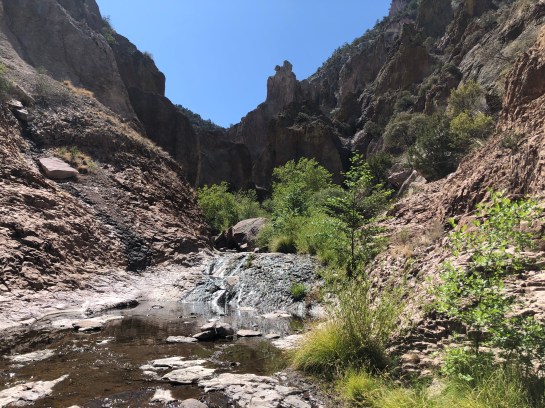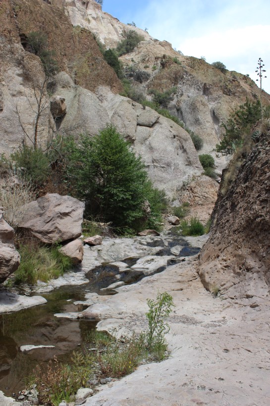 It was about a two hour drive to get to a trailhead where we could hike along a stream that held Gila trout in it at some point upstream. Much like the Gila trout stream in Arizona, this creek was ephemeral, bone dry at the trailhead, so we’d be hiking until we made it to water that was suitable for trout to live in. The valley we drove into was very unassuming, even as we parked, but it didn’t take long during our hike for it to transform into one with spectacular scenery.