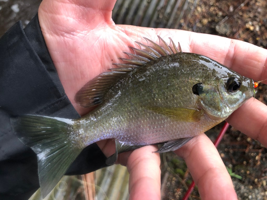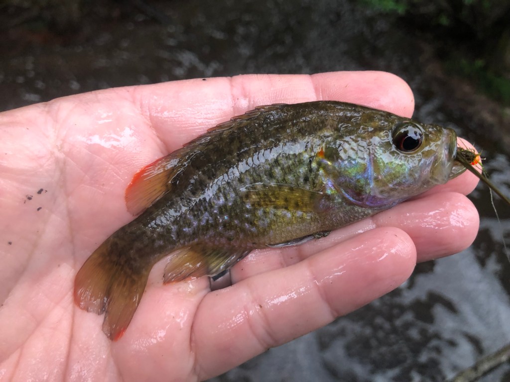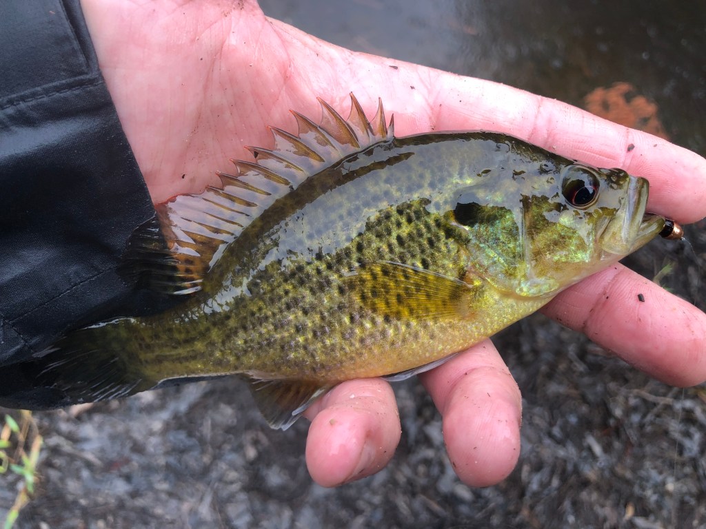 I pulled up at my first stop as the skies opened up and began casting my fly into a hole where a tannic stream poured out of a set of culverts that ran under the highway. I worked the hot head damsel fly from one side of the hole to the other and I tried to work it from the top down because in some spots the deeper I let it drop the easier it was to get hung up. Here’s what I found: