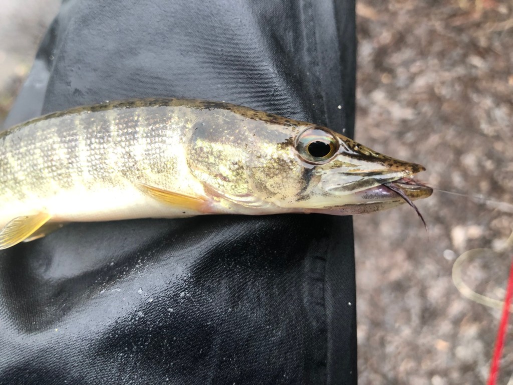 Another mixed bag, no flier this time, but a few more grass pickerel, with the last one being pretty respectable, trending toward the max of their length. You got to watch those pickerel as they do have teeth and if they hit a fly up toward the line you may not get that fly back. I lost a couple flies to teeth while targeting them on this trip. They hit a fly like any Esox, they T-bone it, and I had a little trouble securing the hook up early on with them. I caught enough of them though that I wasn’t kicking myself over it.