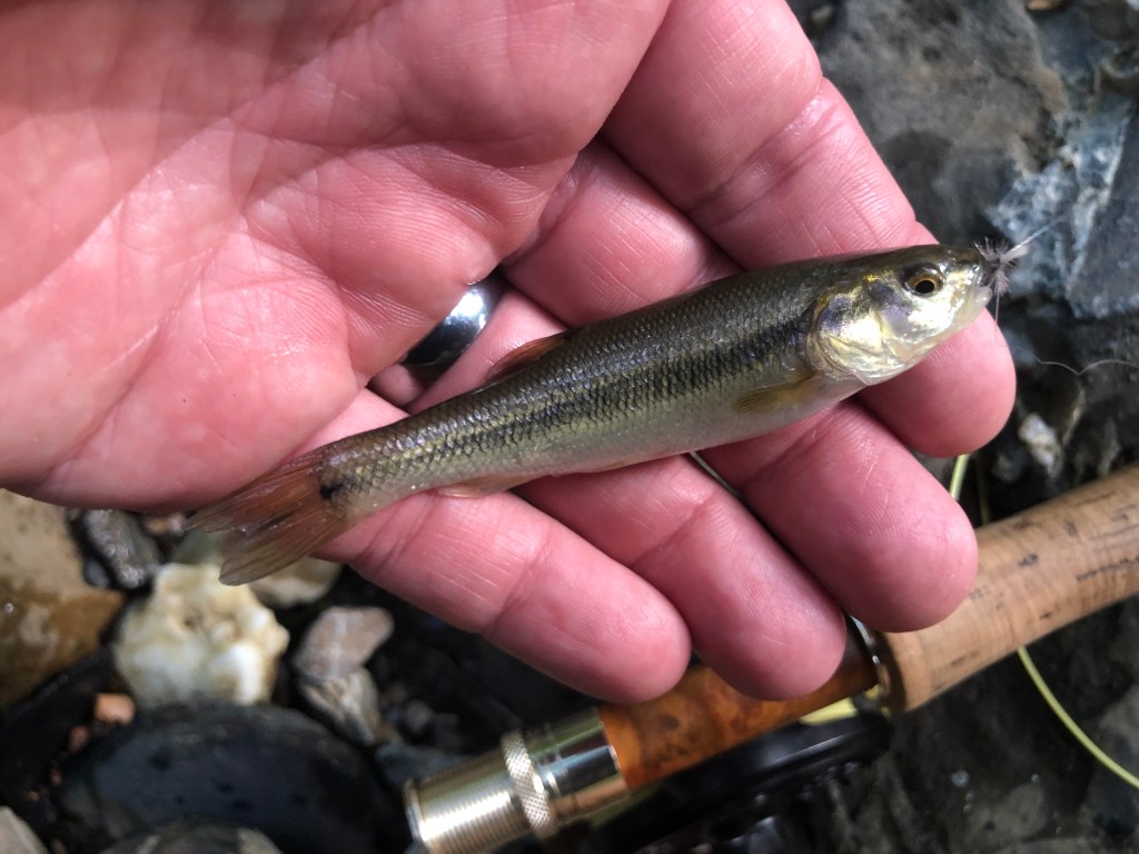I wasn’t so certain I’d find a fish big enough to hit my flies in a creek this small, but I did when this creek chub sucked down my dry. There were a lot of creek chub in the creek, this one just happened to be big enough to get hooked.