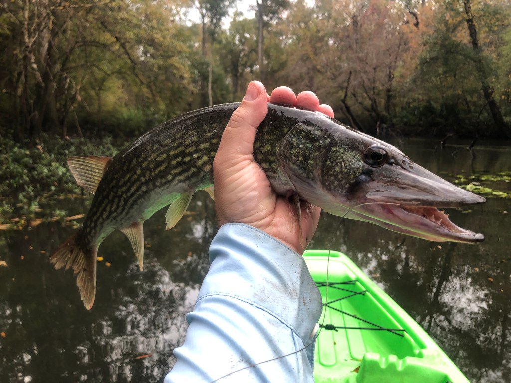 After chatting with a nice lady who worked for the Northwest Florida Water Management District(the folks that managed some of the launches on this creek and the campground I was staying at) at the next put-in, I hit the water and again headed upstream. Being solo on a river with current, it just makes sense to paddle up and fish back down, so that was my strategy throughout my trip. Soon after starting my paddle the skies opened up and of course I had left my rain jacket back in the truck. I did my best to hide under the trees for the hard stuff, but man that rain was cold! When I made it to an area with heavy aquatic vegetation that’s where I began targeting the resident chain pickerel.