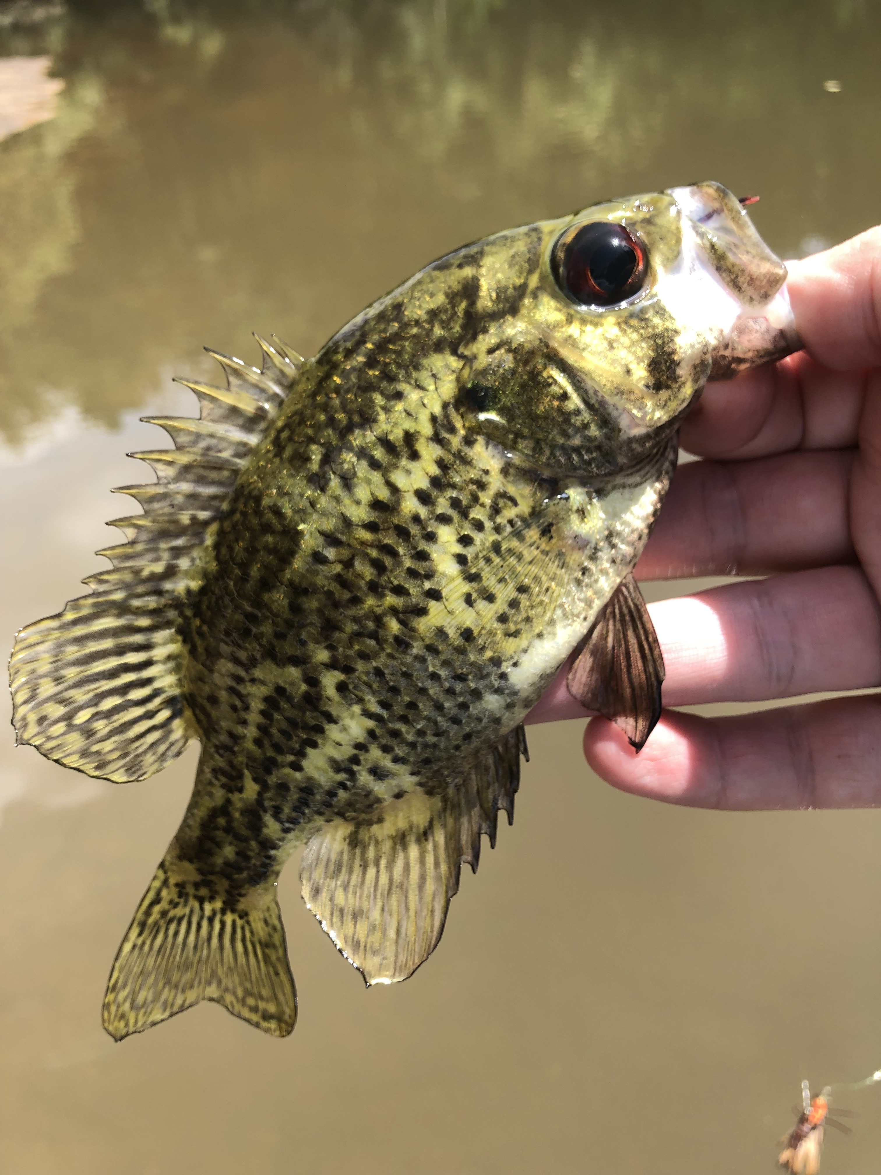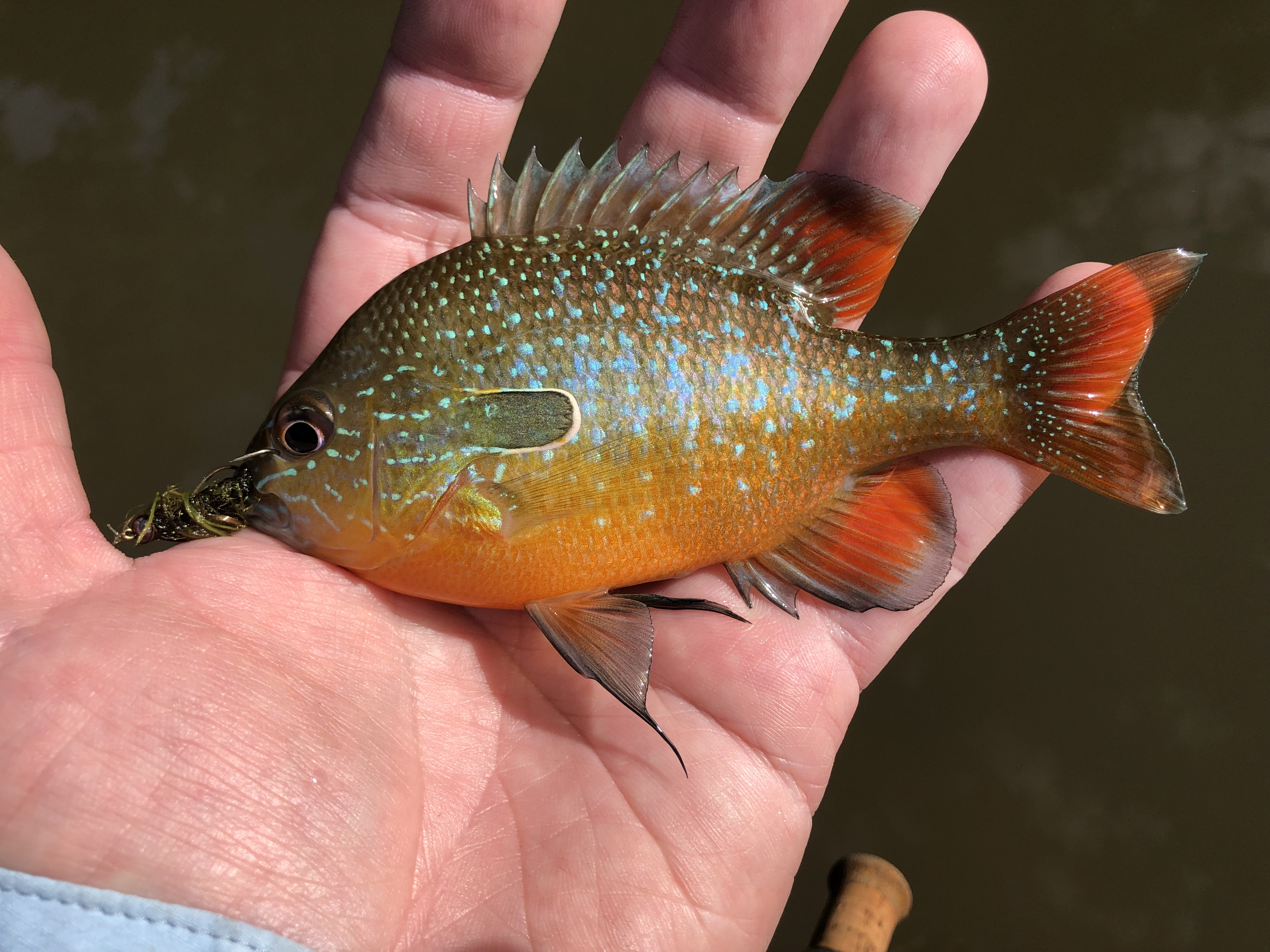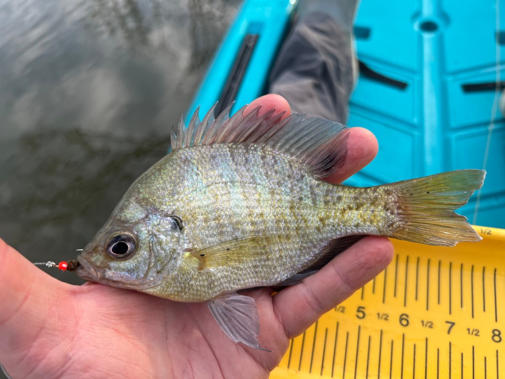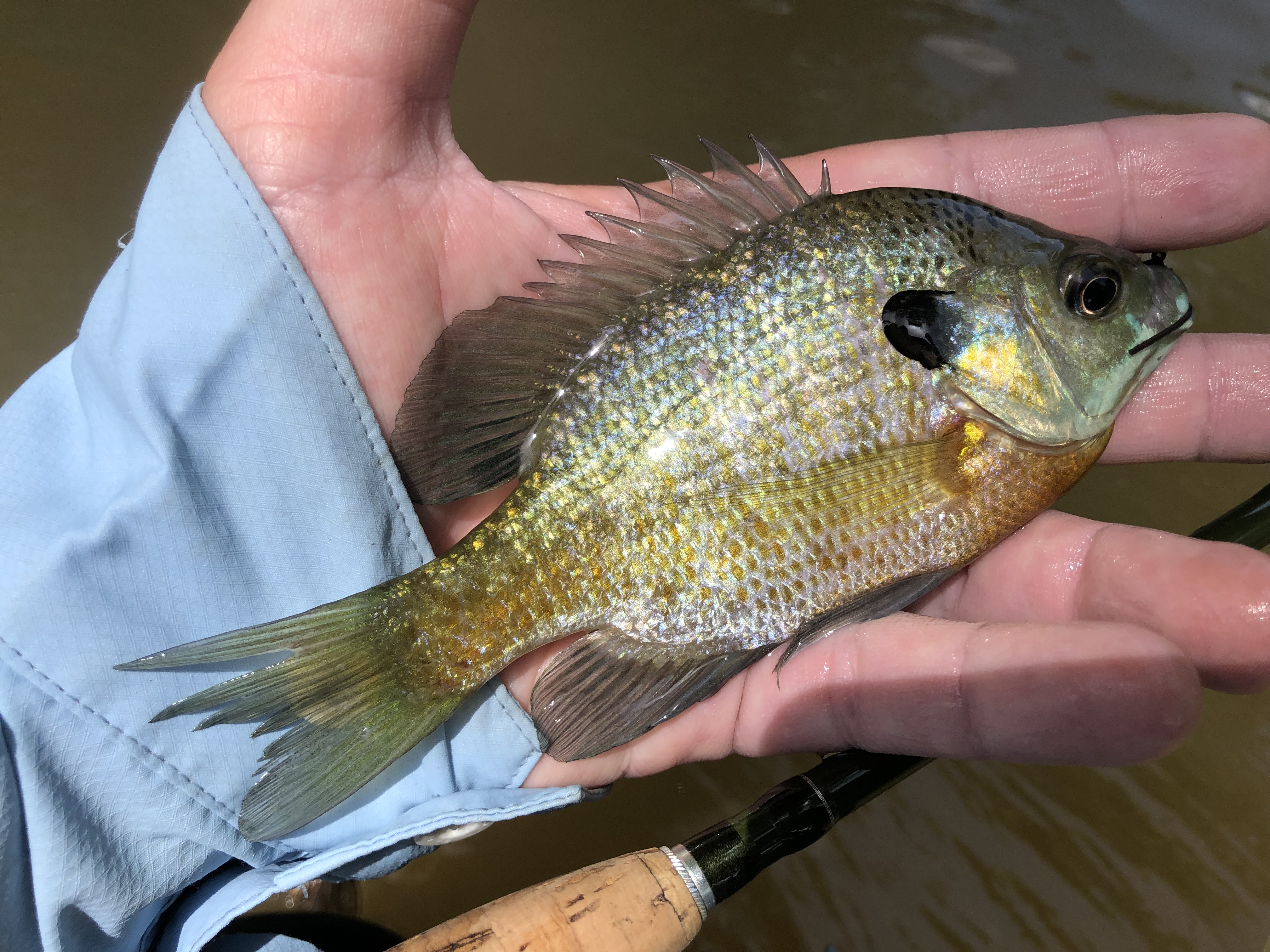 I took off for the northern part of the lake and found shallow water with lilies and vegetation and loads of grass carp. I spent a little bit of time trying to fool one and had a rod at the ready, but I wasn’t really all that prepared for carp so I focused more on targeting bream. I started with a popper-dropper setup and things were pretty slow early on in the lake. I caught my first bluegill off some vegetation closer to the river channel and decided maybe it was best I stick to the deeper water if I wasn’t having any luck in the shallows.