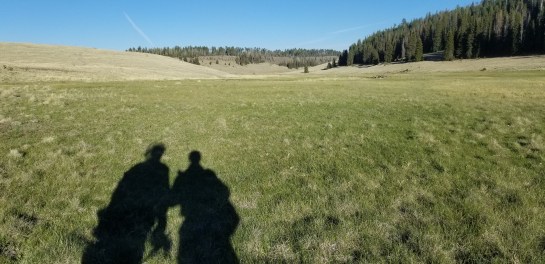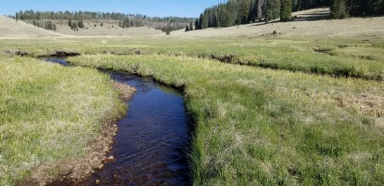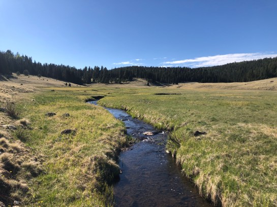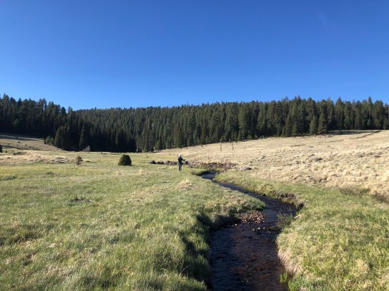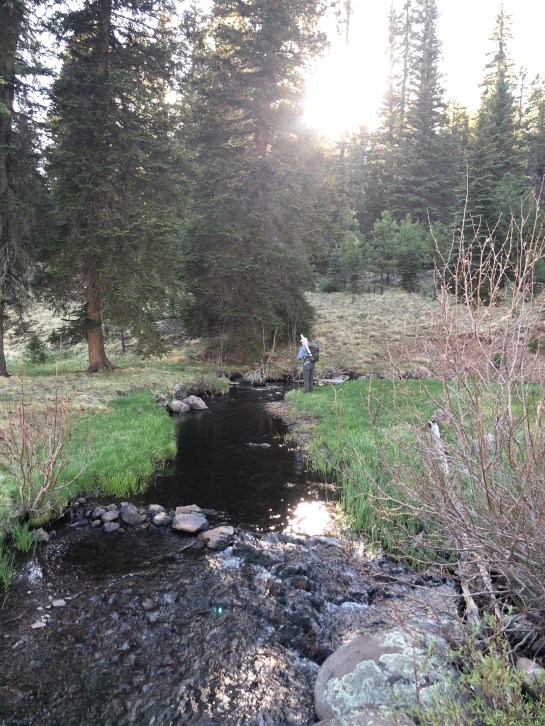 After setting up camp we set out on a local creek to search for Apache trout before dark. The scene was a high alpine meadow with a little meandering creek full of cut banks, what I would consider to be the perfect habitat for high country trout.